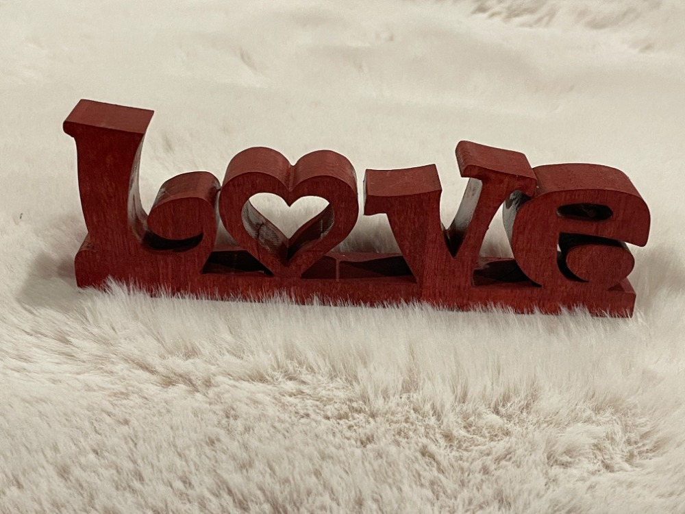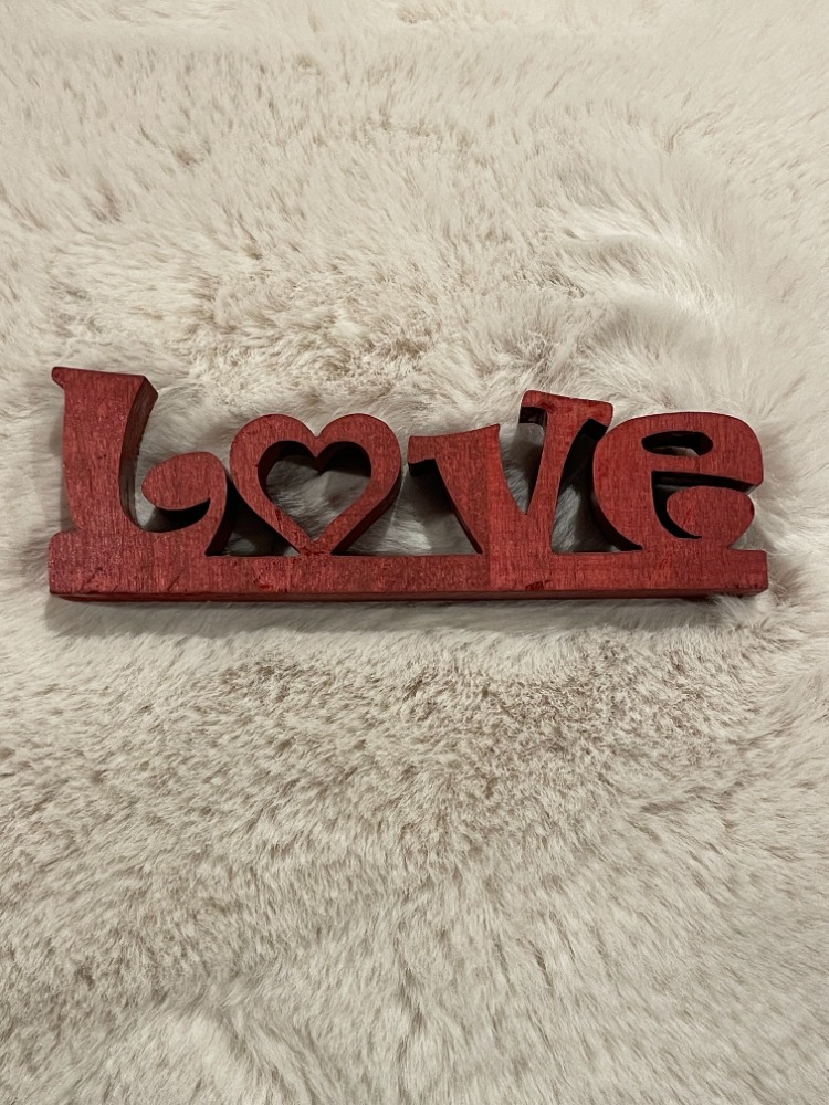 This block of wood is stained red, and is the word “Love” cut out using a fun, goofy font.